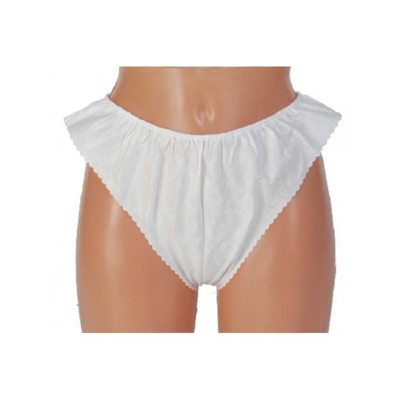 Majtki kosmetyczne (figi) damskie, wykonane z grubej, miękkiej i nieprzeżroczystej włókniny w białym kolorze. Estetycznie uszyte. Rozmiar uniwersalny.