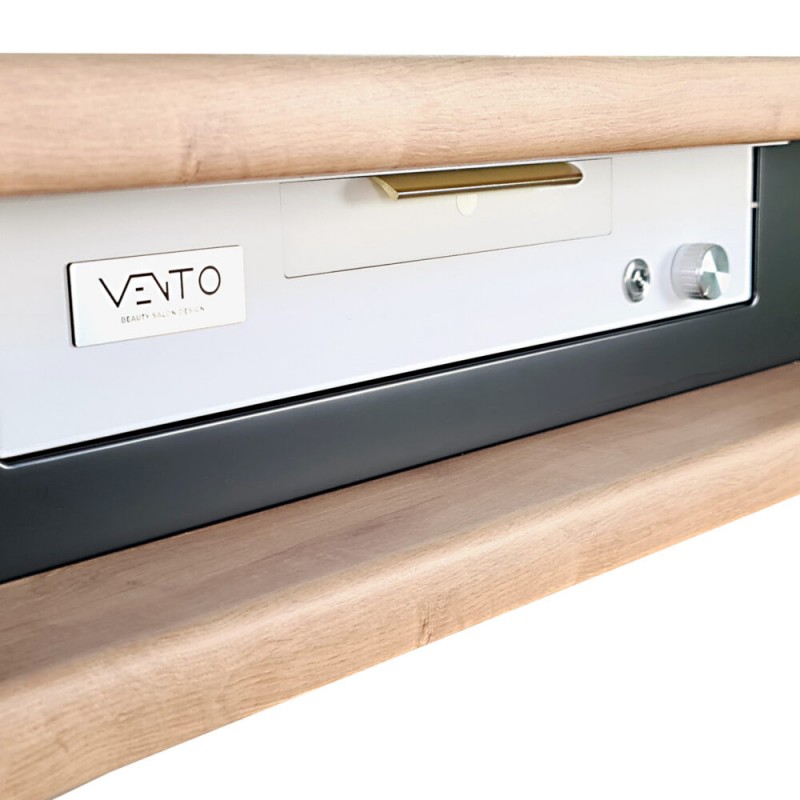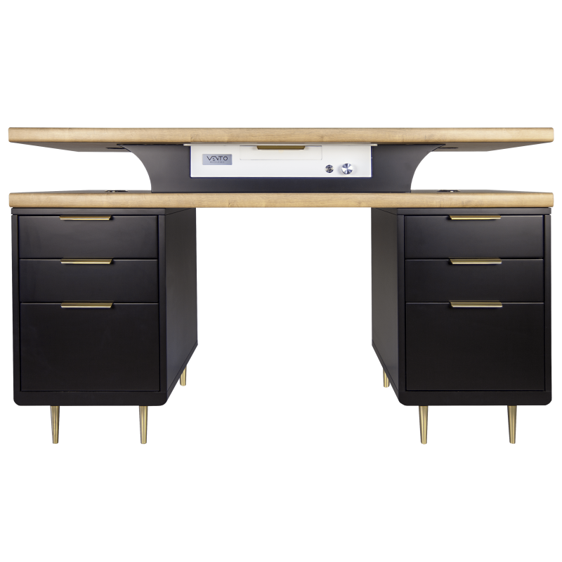 Biurko Black Cavier z pochłaniaczem pyłu VENTO PRO PLUS to połączenie lakierowanych powierzchni w kolorze czarnym – ze złotymi uchwytami oraz najmodniejszymi nóżkami. Dodatkowym atutem jest elegancka maskownica pochłaniacza od strony stylisty jak i klientki. Całość dopełnia motyw drewna w postaci dwóch blatów.