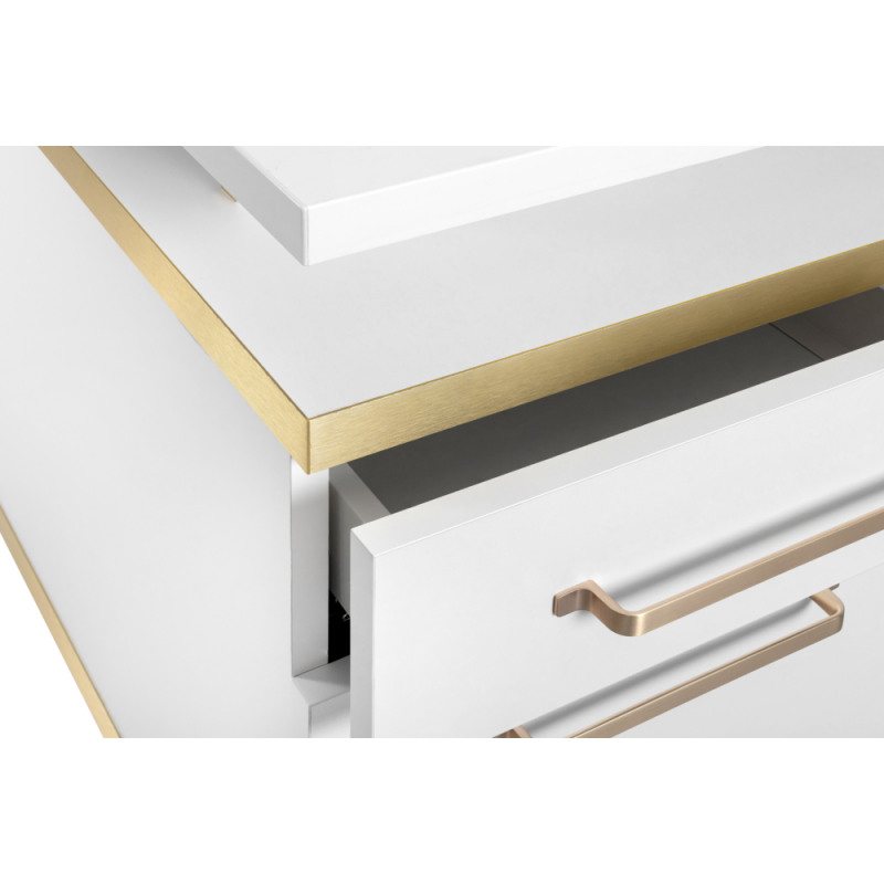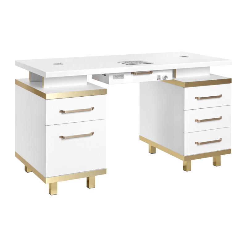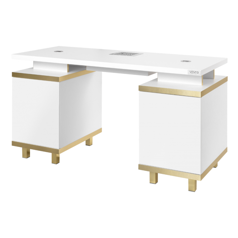 Biurko Elegante Bianco z pochłaniaczem pyłu VENTO PRO PLUS przynosi harmonię funkcjonalności i estetyki. Jego biały kolor jest w krok z najnowszymi trendami. Dodaje świeżości i elegancji każdemu salonowi paznokci. Posiada złote, podłużne uchwyty oraz nóżki. Biurko Elegante Bianco emanuje luksusem, tworząc przyjemną atmosferę pracy.