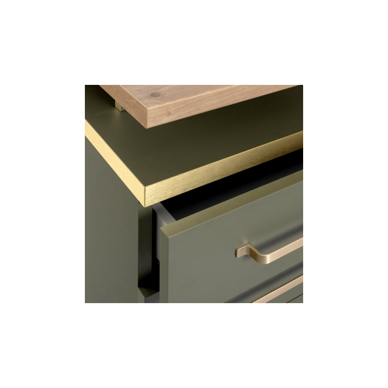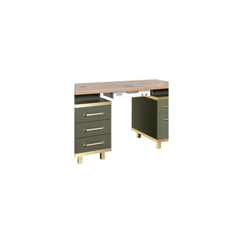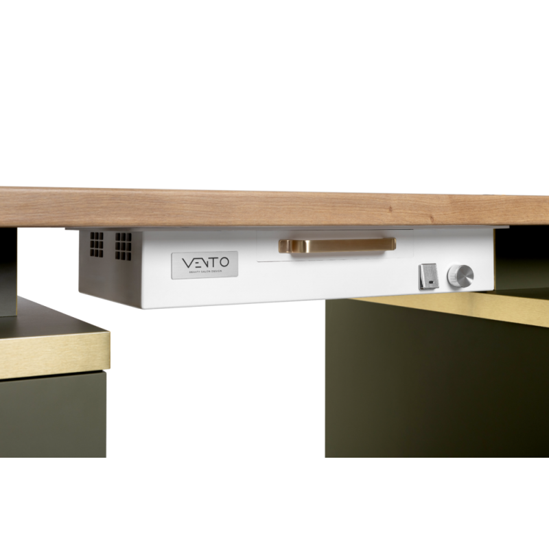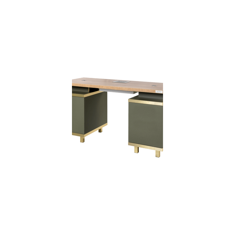 Biurko Elegante Oliva z pochłaniaczem pyłu VENTO PRO PLUS przynosi harmonię funkcjonalności i estetyki. Jego zielono oliwkowy kolor jest w krok z najnowszymi trendami. Dodaje świeżości i elegancji każdemu salonowi paznokci. Posiada złote, podłużne uchwyty oraz nóżki. Biurko Elegante Oliva emanuje luksusem. Tworząc przyjemną atmosferę pracy.
