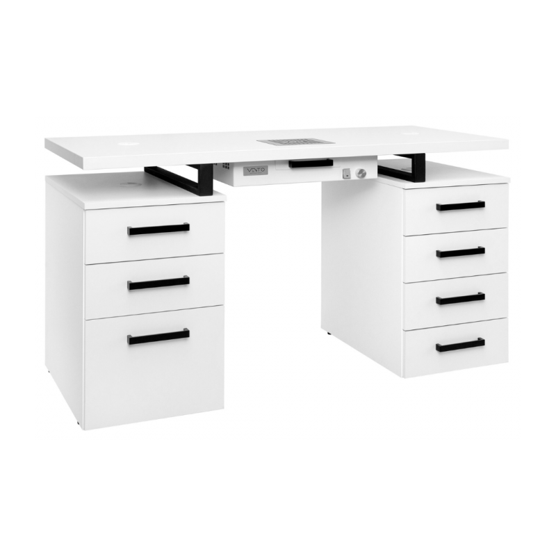 Biurko Moderno Duo 4 z pochłaniaczem pyłu VENTO PRO PLUS to elegancka i funkcjonalna propozycja do nowoczesnych wnętrz. Charakteryzuje się ono prostą formą, która doskonale wpasuje się w estetykę loftowych salonów. Wykonane z połączenia białego blatu z białymi kontenerami oferuje zarówno estetykę, jak i praktyczność.