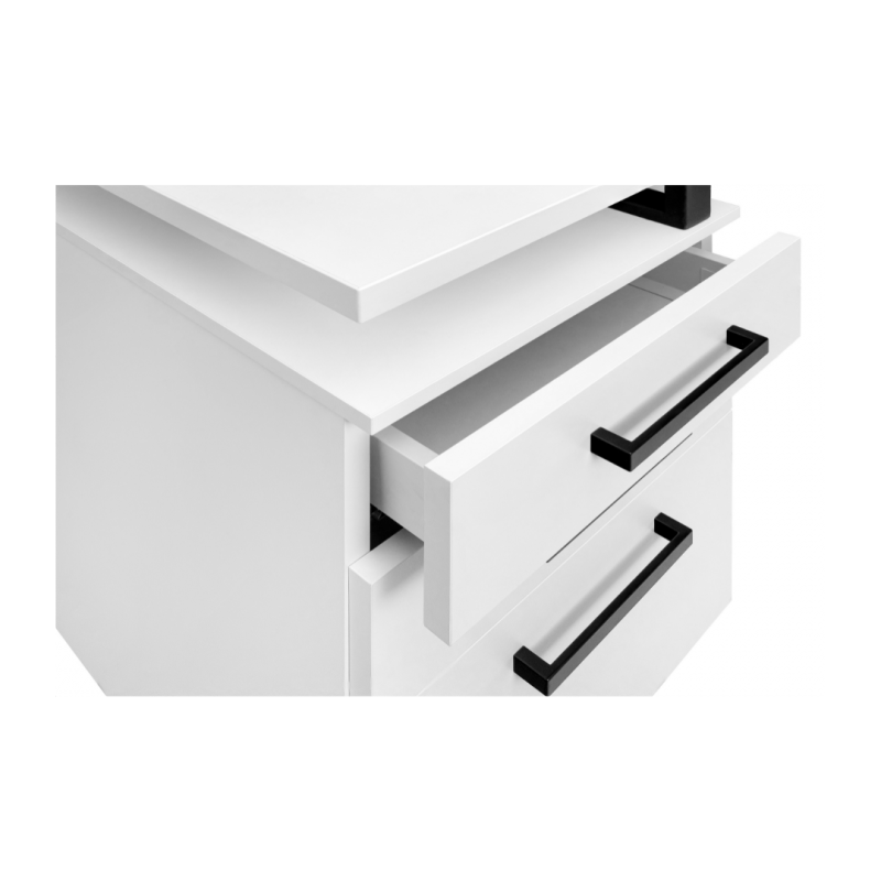 Dodatkowym atutem są podłużne, czarne uchwyty, które nadają całości nowoczesnego charakteru. Elementy łączące blat z kontenerami, wykonane z malowanej proszkowo stali, gwarantują trwałość i odporność na uszkodzenia.