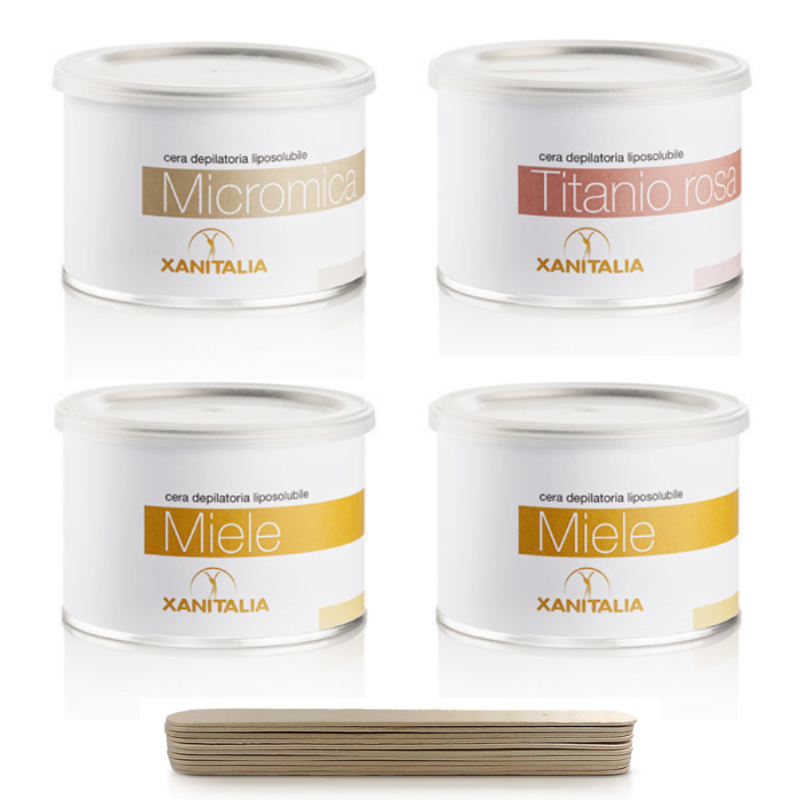 Zestaw do depilacji – COLORFUL WAXES – 4 X wosk w puszce 400ml + szpatuły 100 sztuk