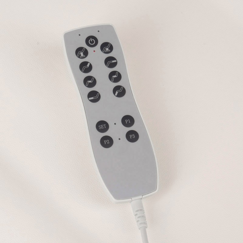 - Sterowanie pilotem, przyciskami sterującymi przy siedzisku i oparciu oraz sterowanie nożne na podstawie.