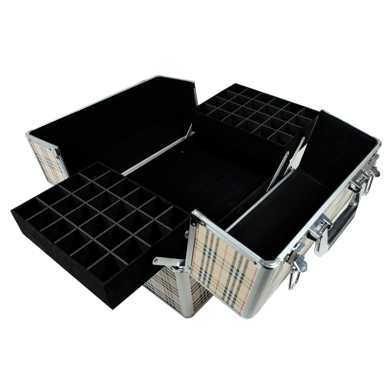 2 rozkładane półeczki na lakiery (jedna półeczka mieści 24 lakiery, kratka jest wyjmowana) o wymiarach: 15cm x 21,5cm x 4,5cm wysokości