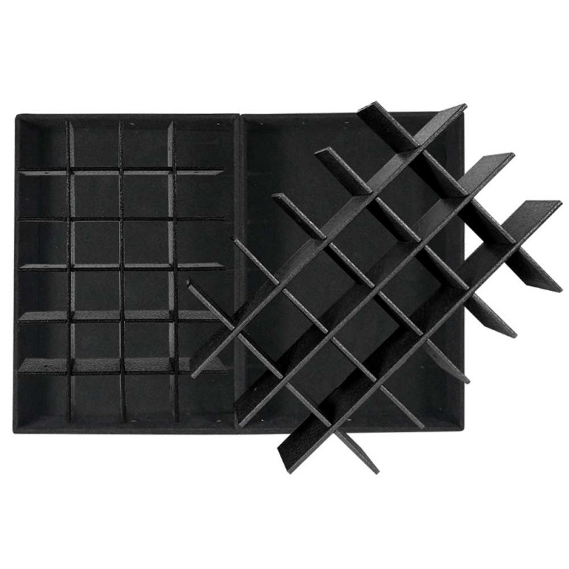 - 2 rozkładane półeczki na lakiery (jedna półeczka mieści 24 lakiery, kratka jest wyjmowana) o wymiarach: 15cm x 21,5cm x 4,5cm wysokości