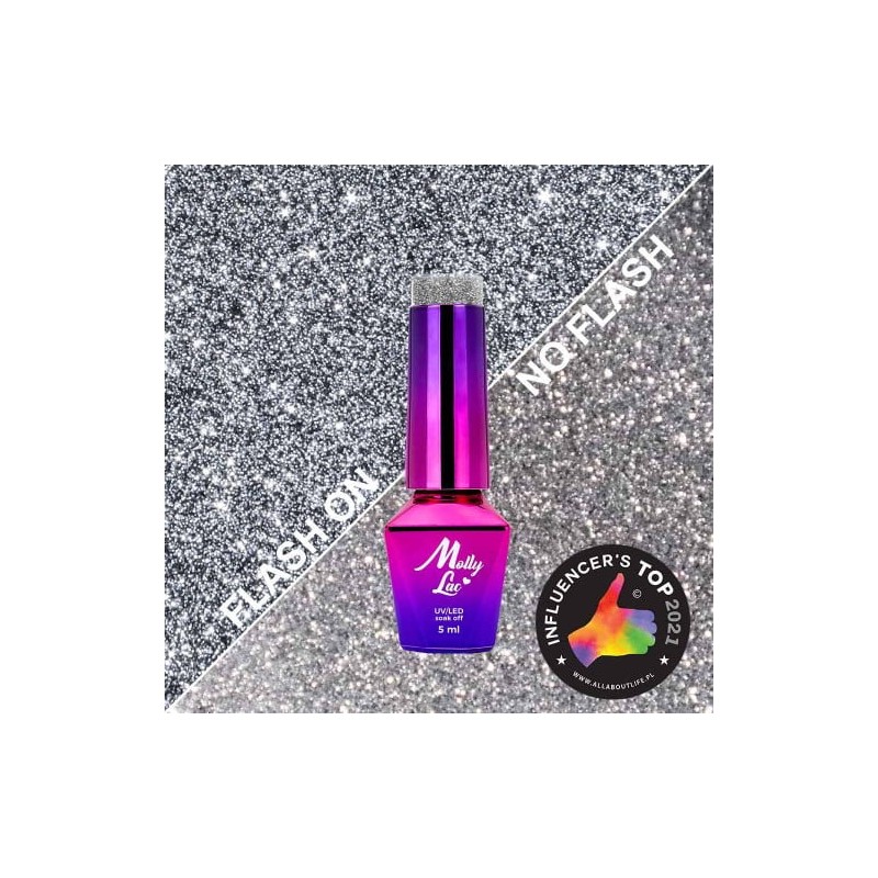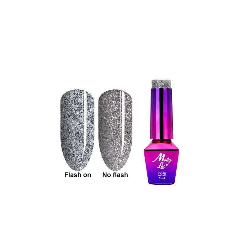 Flashing Lights. To właśnie od światła wszystko się zaczyna… I na świetle kończy! Kolekcja wysublimowanych barw od MollyLac skrywa w sobie dwie twarze. Pierwsza z nich to przydymiona wersja koloru z delikatnym gwiezdnym pyłem, druga z nich z kolei ukazuje miliony roziskrzonych srebrzystych drobinek skąpanych w pięknych kolorach. To, która wersja będzie widoczna, zależy tylko od światła i jego natężenia! 9 intrygujących barw z wyjątkowym, srebrzystym pyłem to unikalna propozycja na letni manicure. Kolory niezwykle uniwersalne – sprawdzą się absolutnie na każdą okazję! Zmień swoje spojrzenie na manicure i rozbłyśnij! Miliony diamentowych drobinek zamknięte w designerskiej buteleczce pozwoli Ci poczuć się jak prawdziwa gwiazda Hollywood na czerwonym dywanie! Kolory z pozoru ciemne, stłumione otwierają swoje skrzydła już przy odrobinie światła, które zapala w nich nowe, roziskrzone życie!
