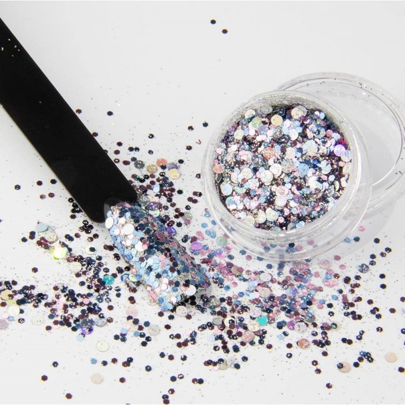 Pokaż siebie w nowej odsłonie. Idealna proporcja drobnego pyłku z dużymi widocznymi drobinami przypominającymi odbijające światło lusterka. Zachwycaj blaskiem w kolorze metalicznego aluminium z pobłyskiem różu i niebieską poświatą.